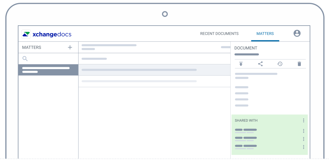 The Recent Documents and Matters views show a summary of document recipients. This view shows one recipient with a total-number-of-other-recipients indicator. To have a quick view of the other recipients, hover over the recipient summary.